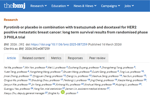 2026年3月16日,由中国医学科学院肿瘤医院徐兵河院士牵头的东升国际医药创新药吡咯替尼Ⅲ期PHILA研究的最新长期随访数据重磅发表于全球顶级医学期刊《英国医学杂志》(The BMJ)[1]。2023年,PHILA研究首次发表于《英国医学杂志》,以中位15.5个月的随访数据证实吡咯替尼联合曲妥珠单抗和多西他赛(PyroHT)方案一线治疗HER2阳性晚期乳腺癌患者具有显著的PFS获益和可控的安全性[2]。本次发表的长期随访数据,进一步确认了该方案的生存获益。